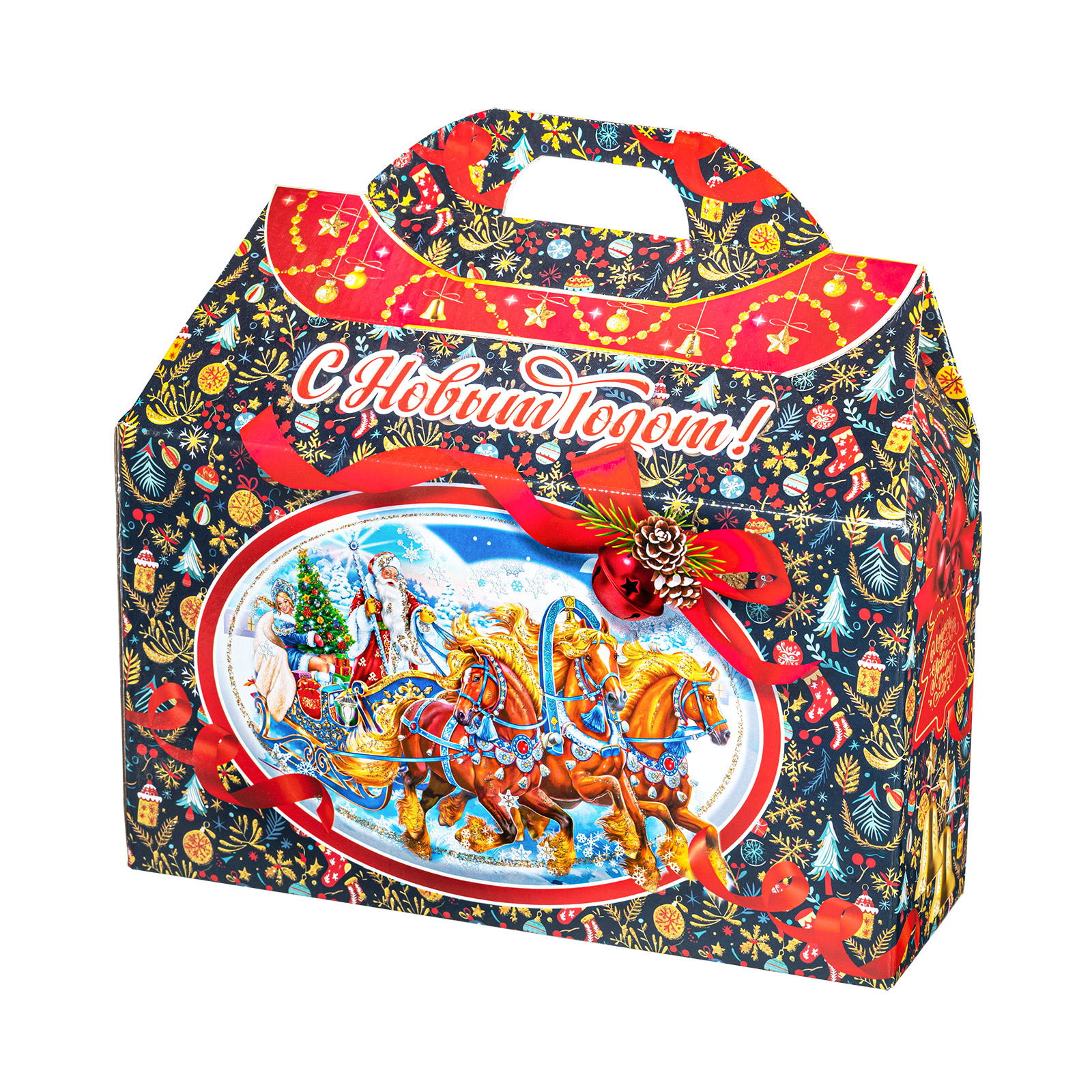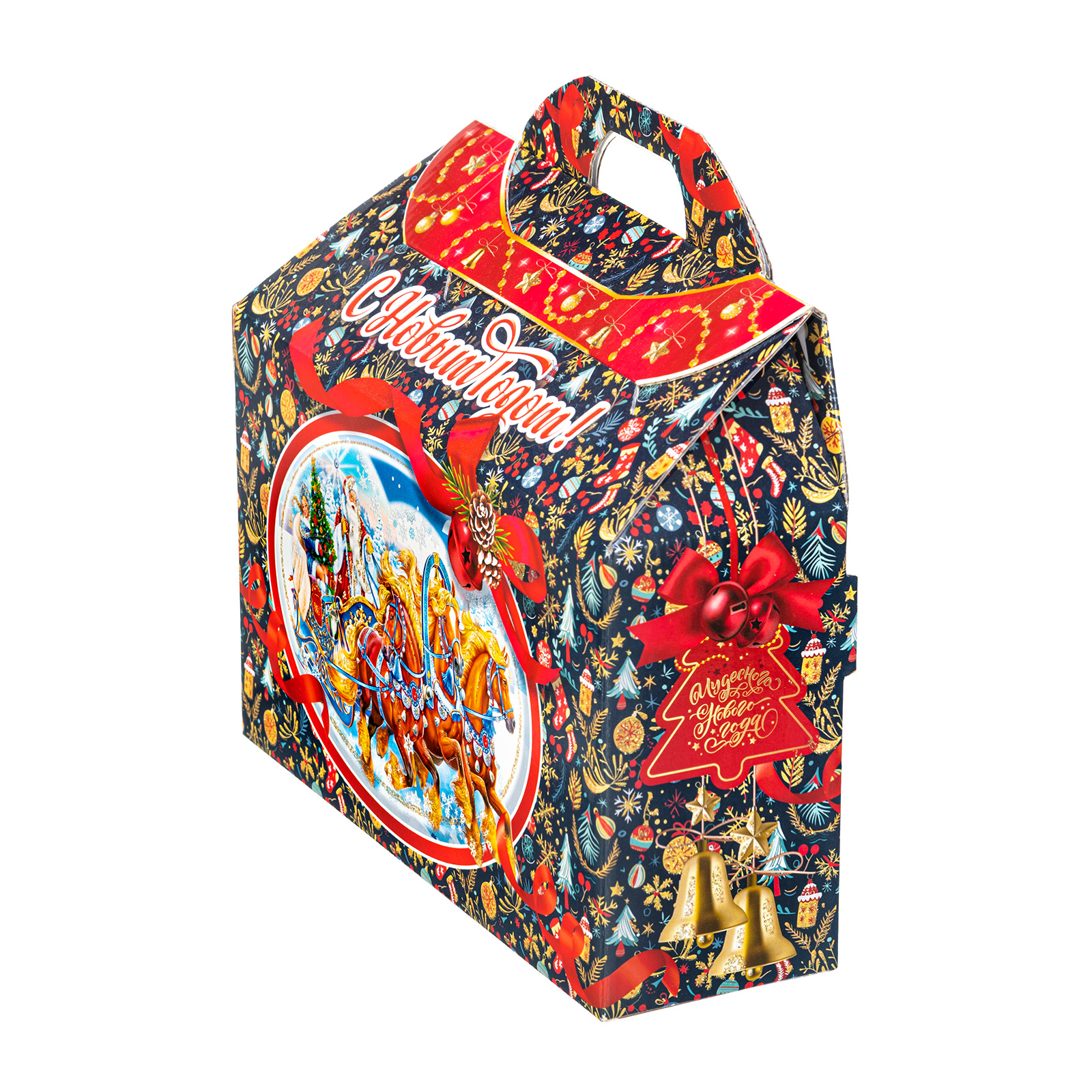 Представляем вам Новогодний Сладкий Подарок в форме стильного чемоданчика! Этот уникальный набор подходит как для подарков близким, так и для корпоративов, создавая атмосферу волшебства и тепла в эти зимние дни!Яркая упаковка сразу привлечет внимание своим оформлением: темно синий фон здесь идеально сочетается с контрастными элементами. Наличие удобной прорезной ручки делает подарок очень удобным для транспортировки.  Внутри набора находятся разнообразные вкусные сладости, которые станут украшением любого праздничного стола. Помимо сладкого наполнения, набор может порадовать небольшим памятным сувениром в виде символа наступающего года.