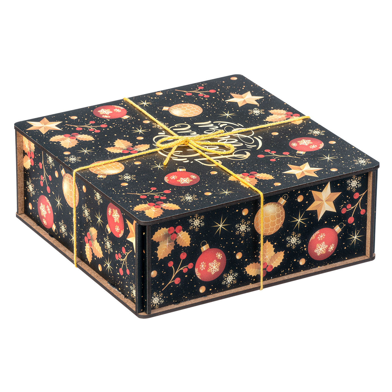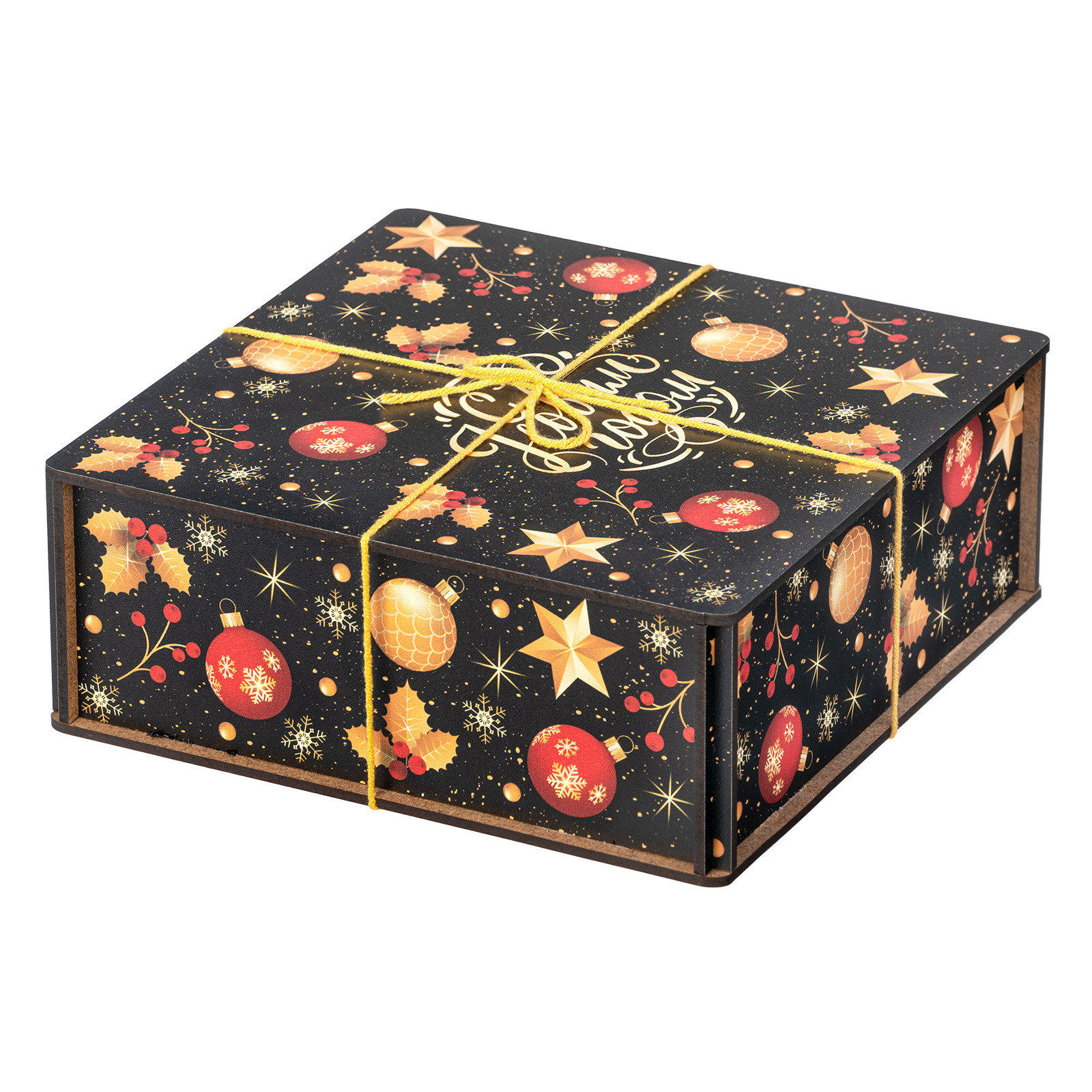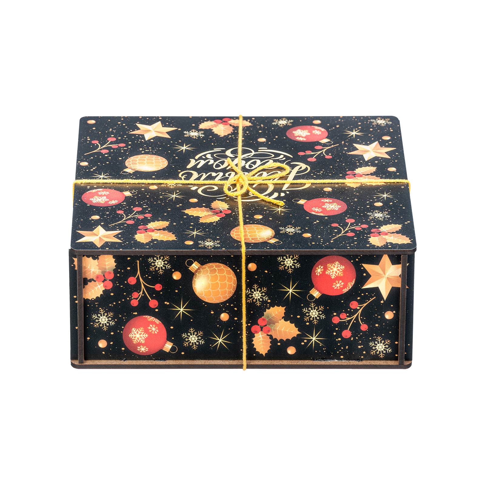 “Рождественская магия” - это новогодний сладкий подарок, отличающийся довольно строгим и оригинальным дизайном. Это небольшой деревянный ящичек темного цвета, украшенный новогодними иллюстрациями и перетянутый ярко-желтой веревкой. Внутри этого ящичка бережно хранятся отборные вкусные сладости и небольшой памятный сувенир в виде лошадки - символа 2026 года. Такой подарок идеально подойдет для поздравления любого взрослого сластены: воспитателя, классного руководителя, коллеги или начальника! Такой набор гарантированно вызовет приятные эмоции у того, кто его получит.