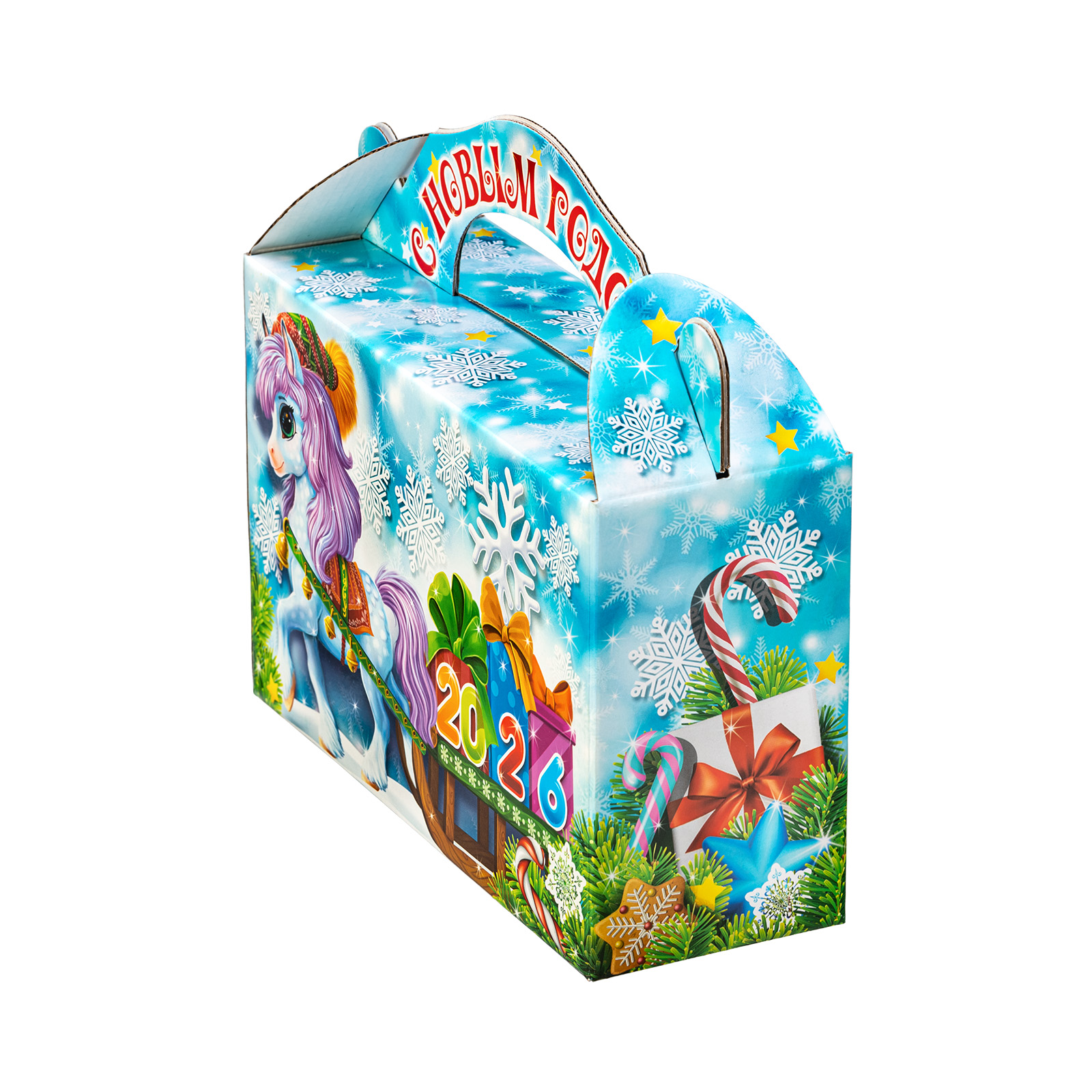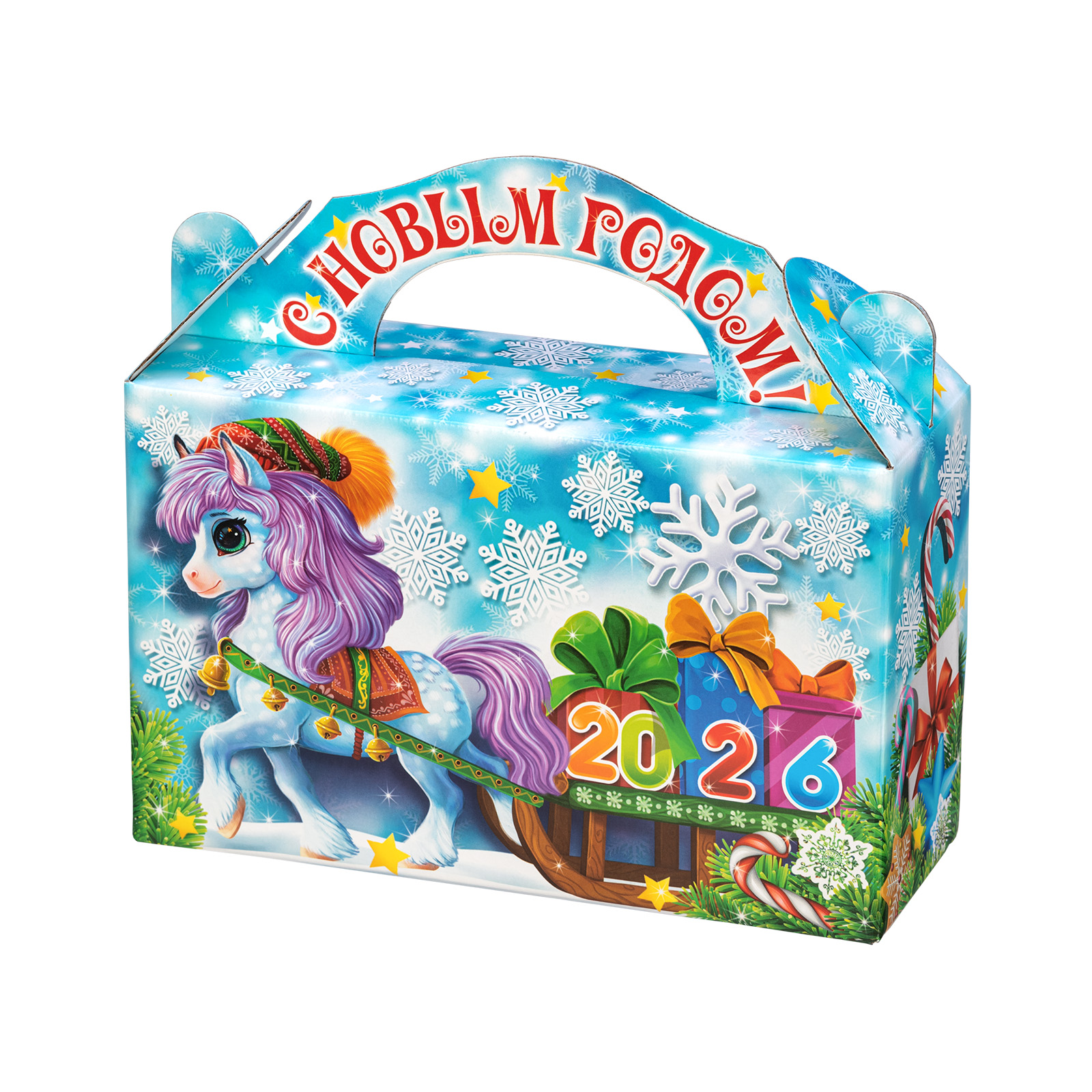 Новогодний сладкий подарок с изображением символа года - это универсальный подарок, который подойдет сластене любого возраста. “Сладкие сани” -это небольшая картонная коробочка нежно-голубого цвета, украшенная со всех сторон разными зимними узорами. На передней части изображена волшебная лошадка с фиолетовой гривой. Она везет упряжку с подарками, на которых обозначены цифры наступающего года. Сверху расположена удобная ручка с поздравительной надписью. Подарок состоит из килограмма отборных сладостей и небольшого памятного сувенира с изображением символа года.